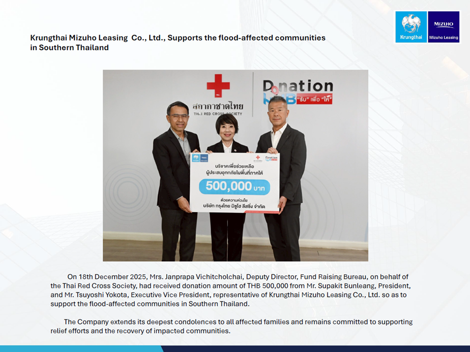 Krungthai Mizuho Leasing Co., Ltd. remains committed to standing by Thai society through every crisis. We are honored to collaborate with government agencies and charitable organizations to provide much-needed support, encouraging our fellow citizens in the South to overcome this challenging period with resilience and safety.